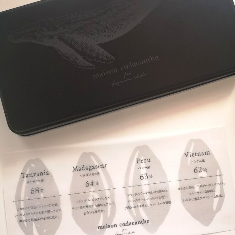 鯨🐳が描かれたスタイリッシュでシンプルな黒い缶の中には4つのカカオ原産地から取れたカカオを使ったチョコケーキ🍫🥧が入っていました✨
