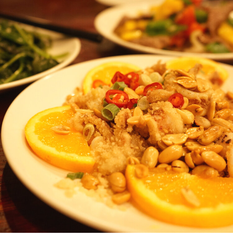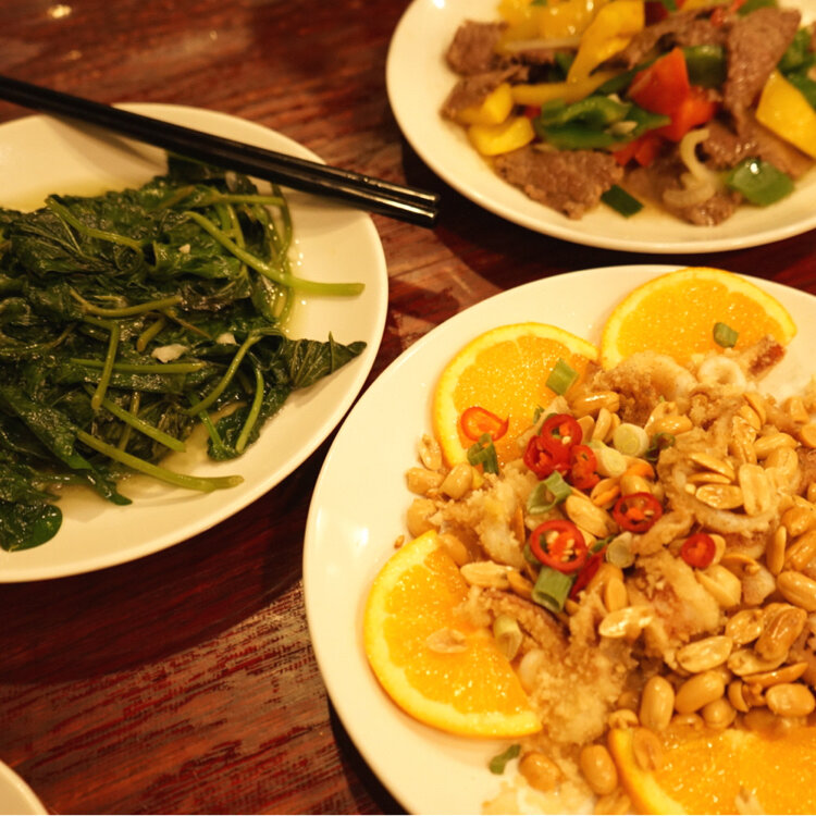 1枚目は食事をした階のテラスから。2枚目はお店の入り口から。3枚目はお店の入り口のさらに下から、まだ薄明るい時間に撮りました。4〜5枚目はここで食べた、イカフライw/ピーナッツやさつまいもの葉のニンニク炒めなどです。