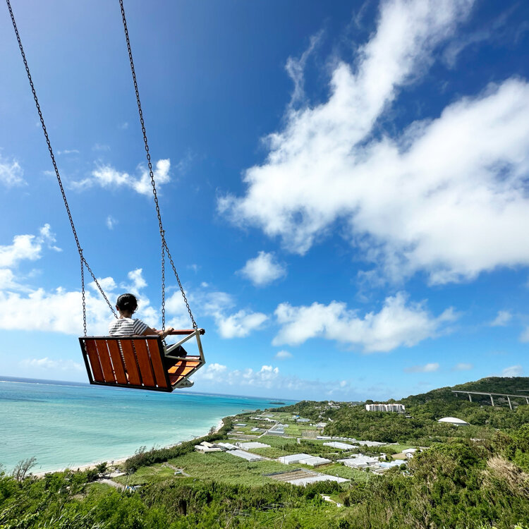 斎場御嶽の見学を終えてもまだ充分時間が残っていたので、「空中ブランコ」なるものに乗ってみた。以前白馬でも似たようなものに乗ったが、海に面した崖から飛び出すようにブランコに乗るもので、眼下に見えるエメラルドグリーンの海は美しいものの、空に放り出されそうなスリルも満点だった。
