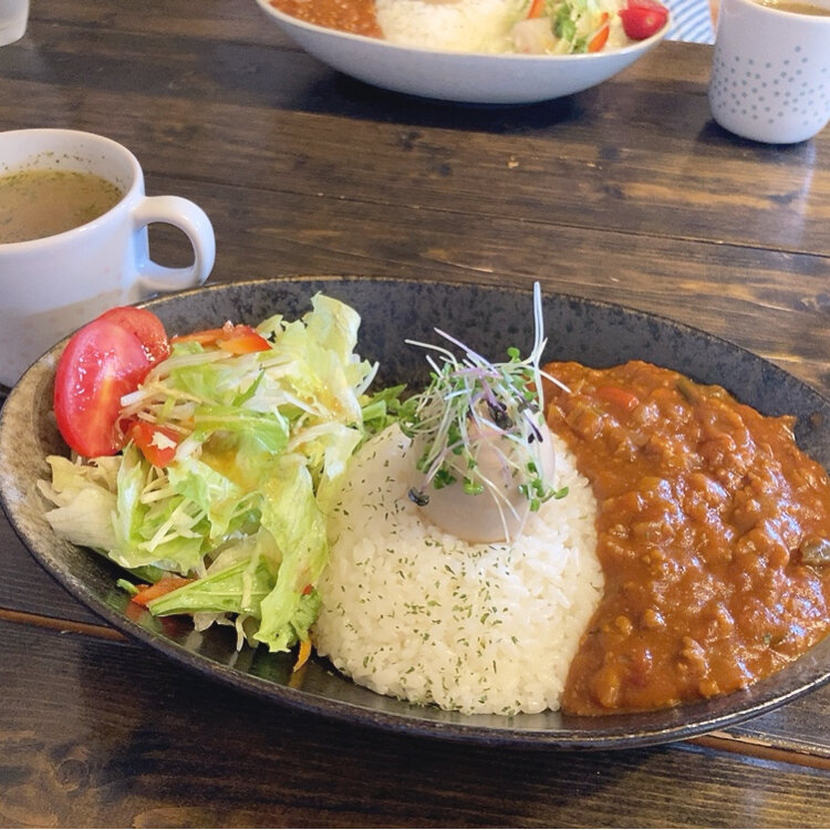 この日のランチメニューはキーマカレー。サラダとスープつき。それにプラスして、コーヒーとデザートを頼みました😋