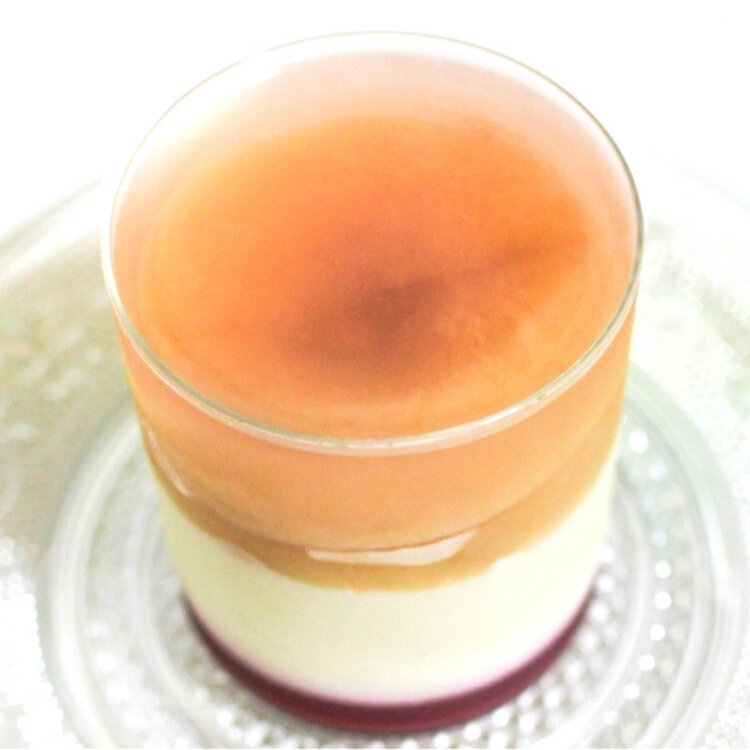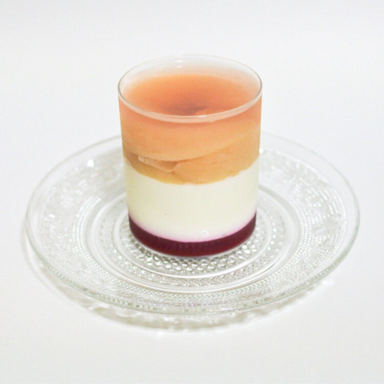 パンナコッタの上に桃のコンポートゼリー、下にはフランボワーズソース。