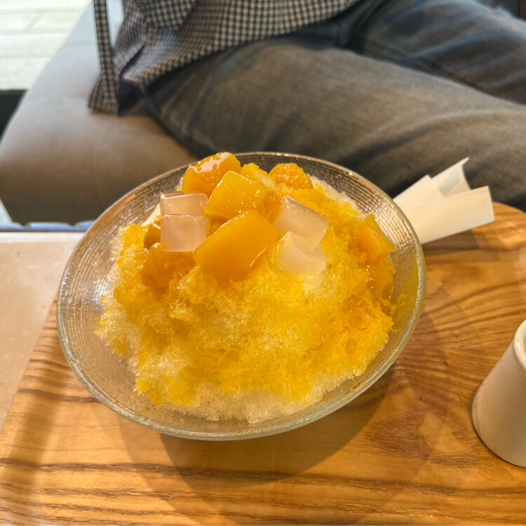 マンゴー氷は練乳ココナッツミルクシロップで、上にはナタデココがON😃