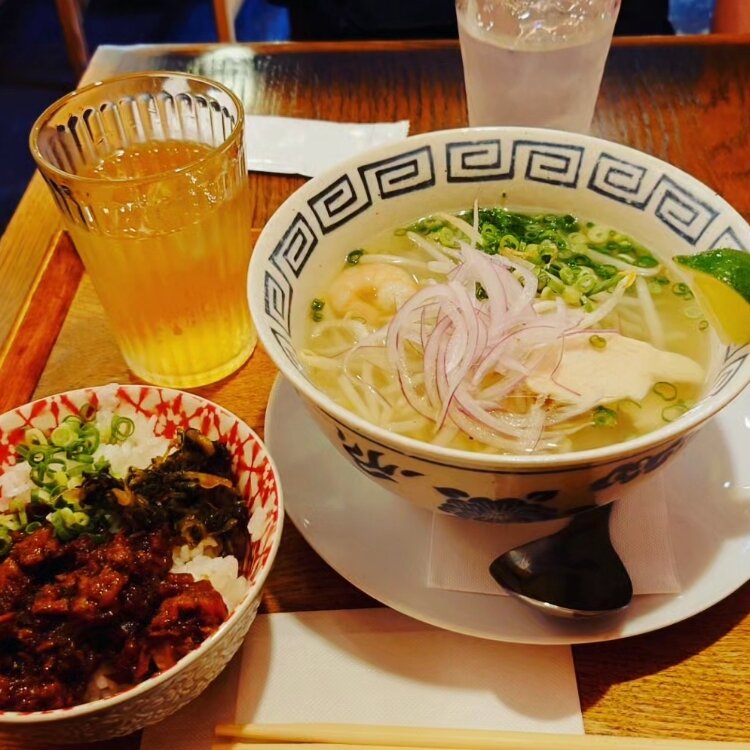 またまたカフェ桃山78さんへ🇻🇳 どーしても、フォーがたべたくて、、、 優しい〜美味しさのフォーと濃厚な魯肉飯に、爽やかなお茶が最高でした☺️ (わたしはパクチーなしでお願いしました) あーおいしかった