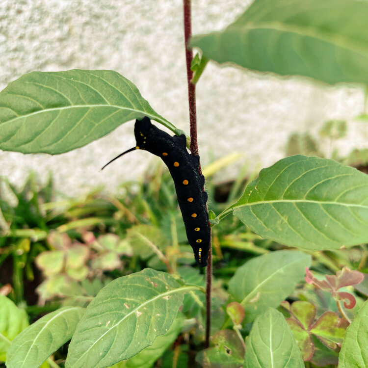 micabuさん♡ こんにちは☀️ 恐怖のスズメガ😱 セスジスズメの幼虫🐛です💦 しっぽのツノも特徴です ぶどうや作物の葉を恐ろしい勢いで 食い荒らす幼虫で 木を枯らすほどです ガになっても恐ろしい大きさです😂