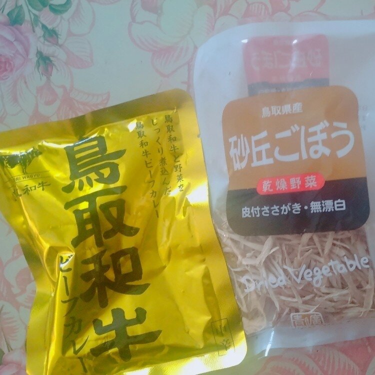 お土産に接写の岡山白桃、鳥取の牛肉カレー、お手軽ゴボウ、カレー用に辣韮を購入。