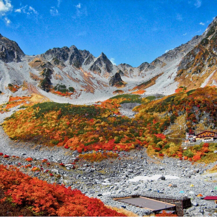 上高地の河童橋からてくてく歩いて約5時間(のんびり歩いたら6時間かな)。奥穂高岳など3000m級の山々に囲まれた絶景の谷間です。