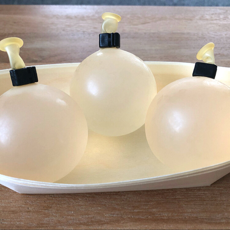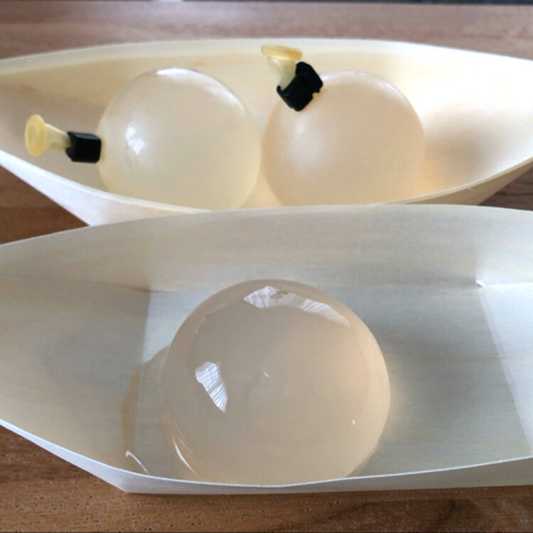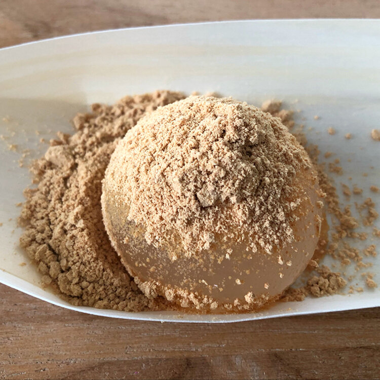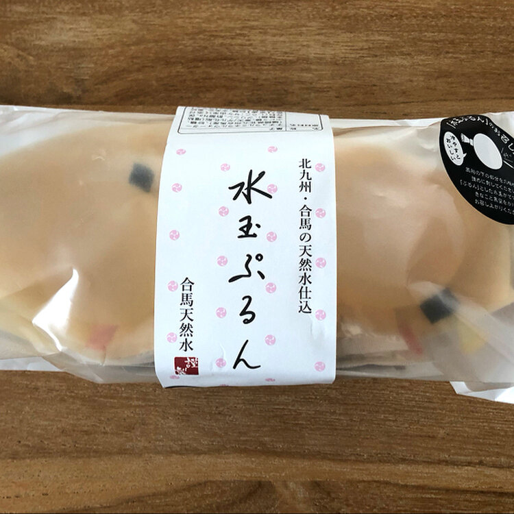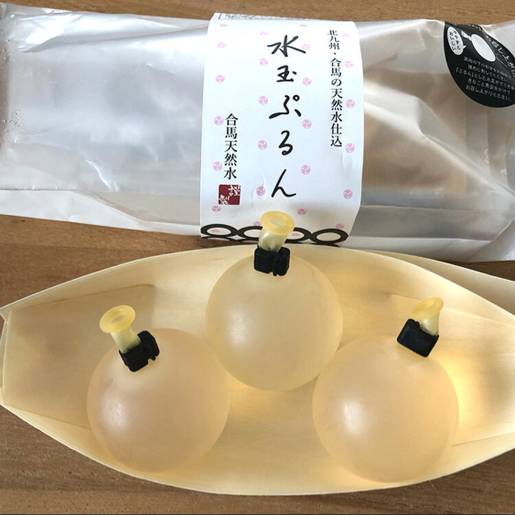 *水玉ぷるん* 合馬の天然水でつくられた透明スイーツ。 水風船を爪楊枝で割ると 中から丸くて透明な水玉が出てきます。 付属の黒蜜やきな粉をかけて食べると 今までに食べたことのない食感。 水をそのまま食べている感覚です。 暑い日でもおいしく食べられる 新感覚スイーツです。
