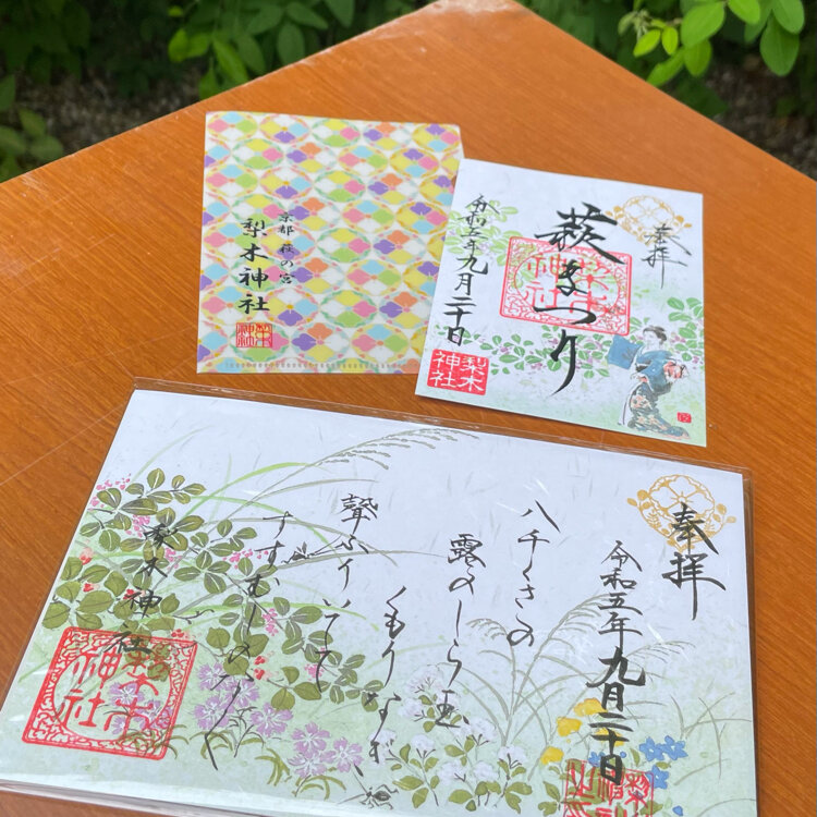 通常サイズの萩まつりで奉納される日本舞踊と萩の御朱印と、見開きサイズの三條實萬公の御歌とその情景を連想して描かれた素敵な御朱印を頂き、バスで四条河原町に戻りました。