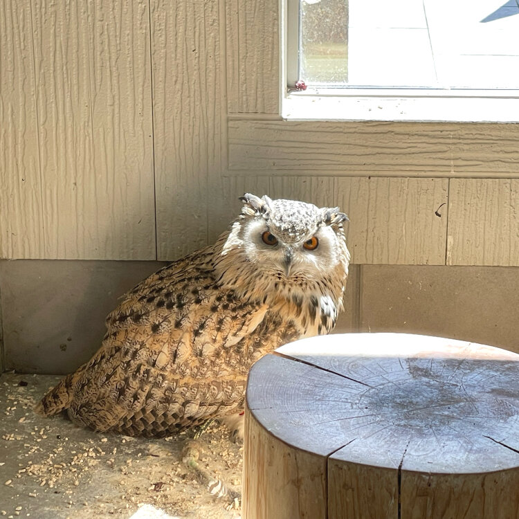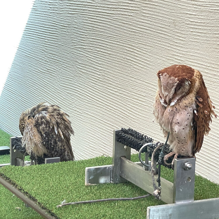 ガラスの向こうに大きなふくろう🦉さんが5羽ほどと、店内に小さなふくろうさんが3羽いました。