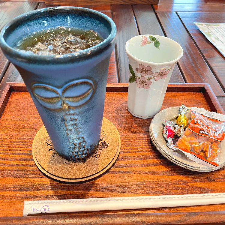 カフェで提供される器は全部ふくろうモチーフで、飲み物(私はアイスピーチティーにしました)にはおかきとチョコのおやつ付き。