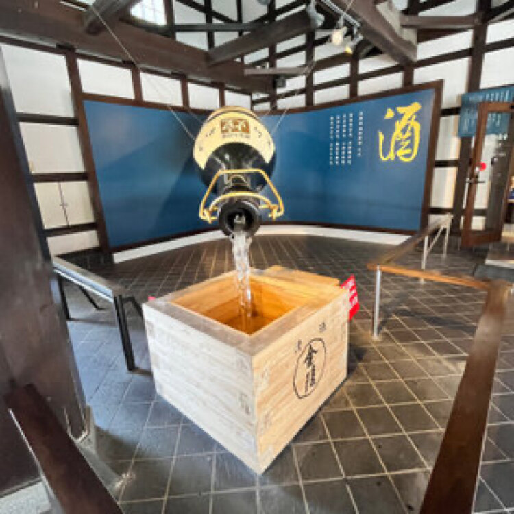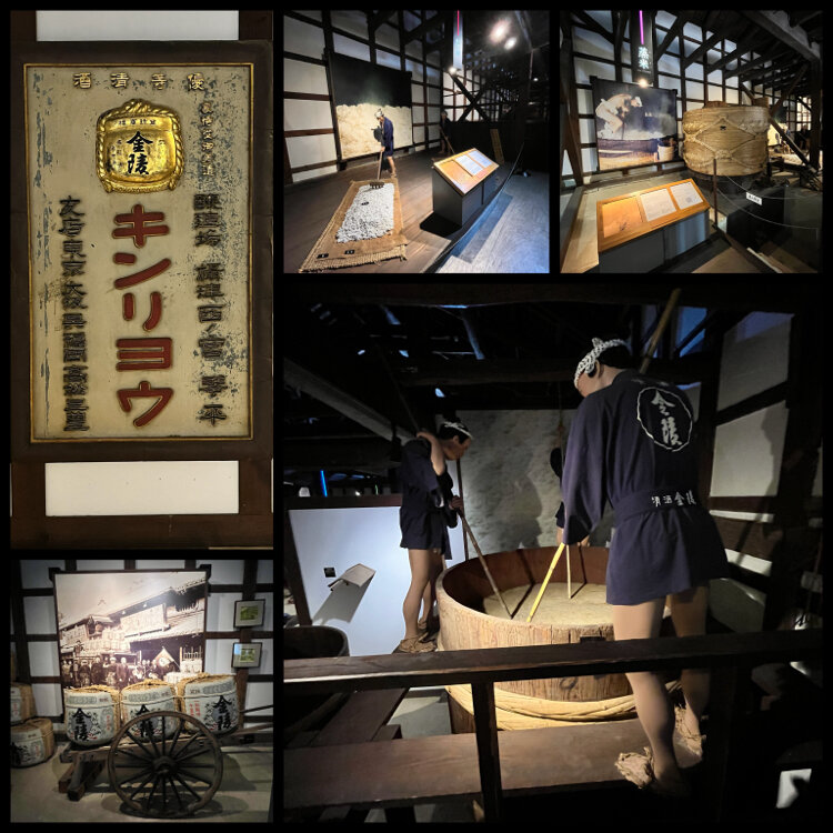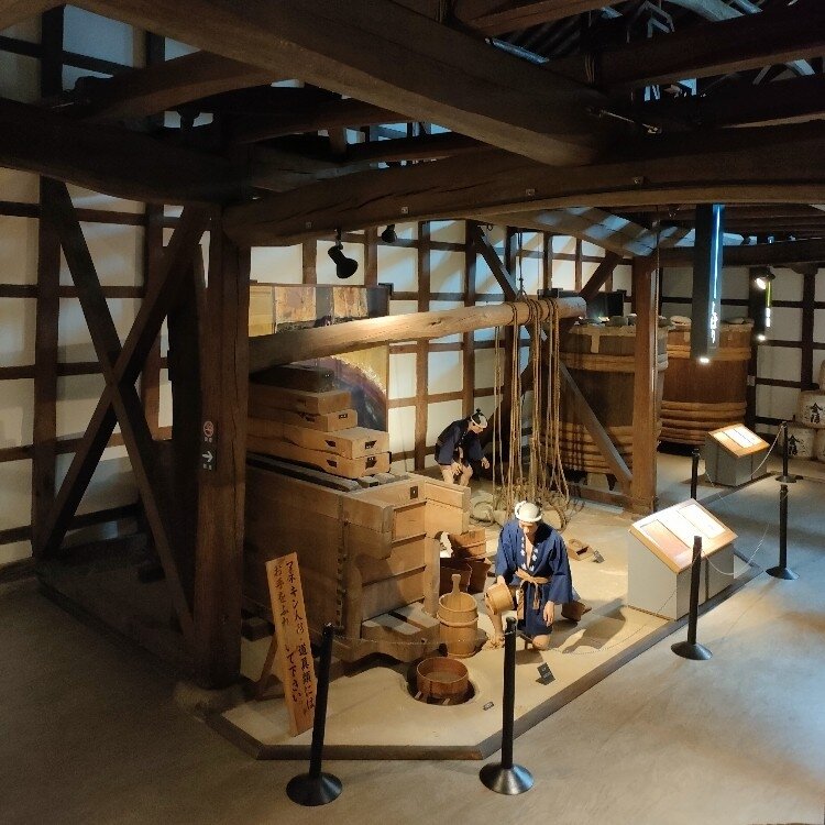 創業1789年の白壁の酒蔵を復元、酒蔵を改築して江戸時代の酒造りの工程を人形と酒造道具で展示されていました。
