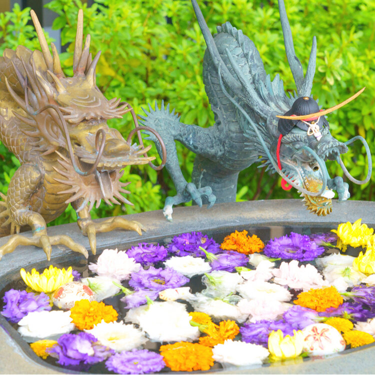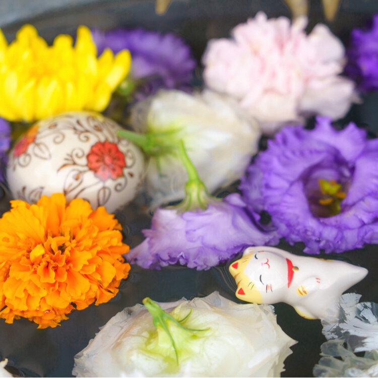 花手水には猫さんが気持ち良さそうにぷかぷかと♡