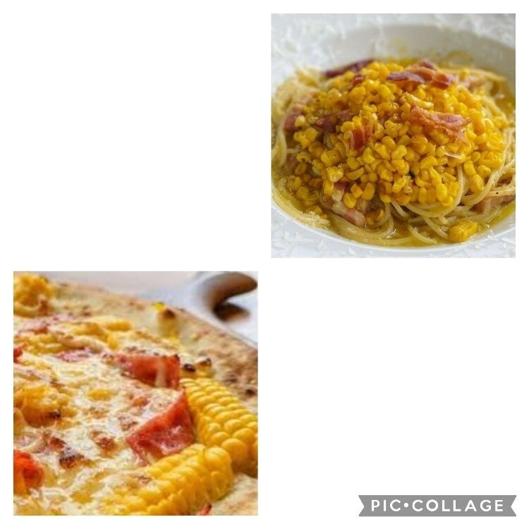 夏のお楽しみ、眼の前の農場で収穫された焼きとうもろこしのパスタ&ピッツァは、甘くてとまりません♫