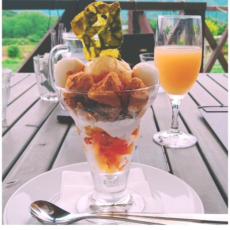 スイーツも桃パフェと桃のジュース、信玄餅の和パフェも美味しいです。