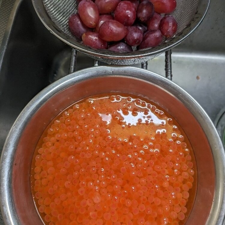 junjun さん〜 今回はクウィーンルージュ🍇 前回のナガノパープルの半分以下値 清水から飛び降り2連チャンはしなかったんですね🤭 今の時代、¥38って..チョー破格値 懐に優しいわ〜 いくらをこうやって変身させるのね 以前の投稿でも(スケルトンほおずき)思ったけど、手間暇や工夫など惜しまなくしますよね👏