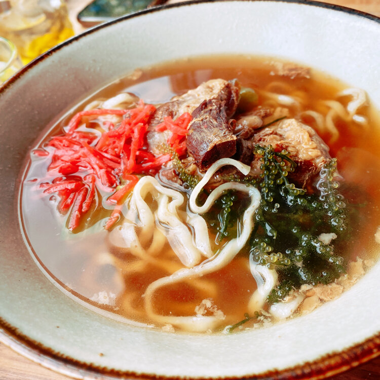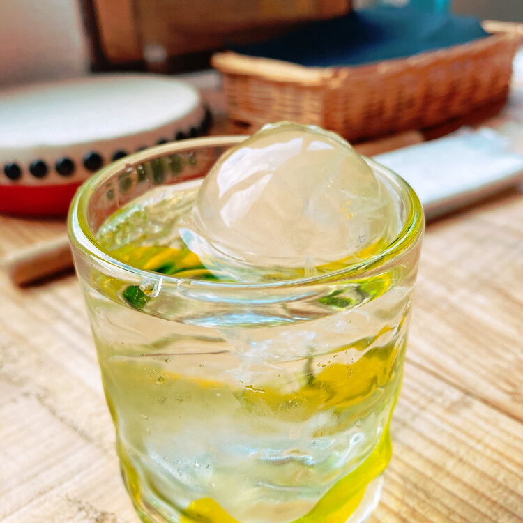 cafe &restaurant Gyu Ton Pan ぎゅうとんぱん でハンバーガーと生サーターアンダギーをテイクアウトする間に出てきたお水。氷が球体! ビールは那覇空港内ブルワリー🍻