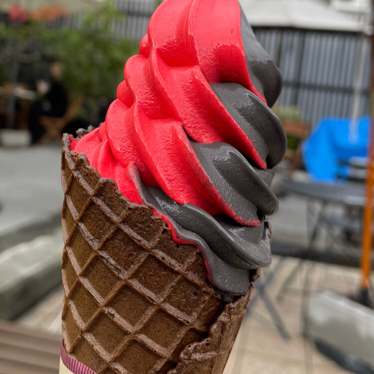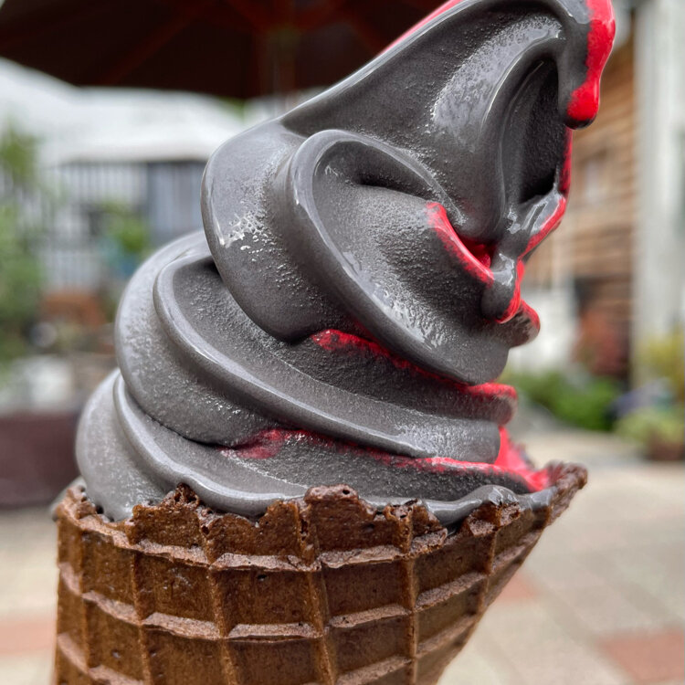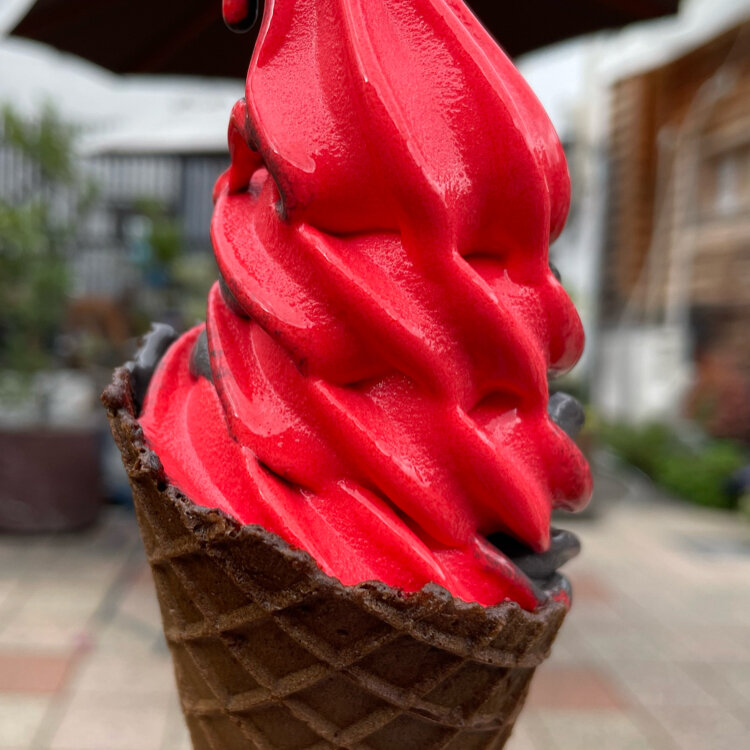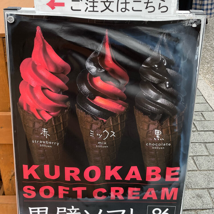 真っ黒なソフトクリームを持って歩いている人の手に目が釘付けになり、珍しく主人も興味津々で、並んで買ってくれました。