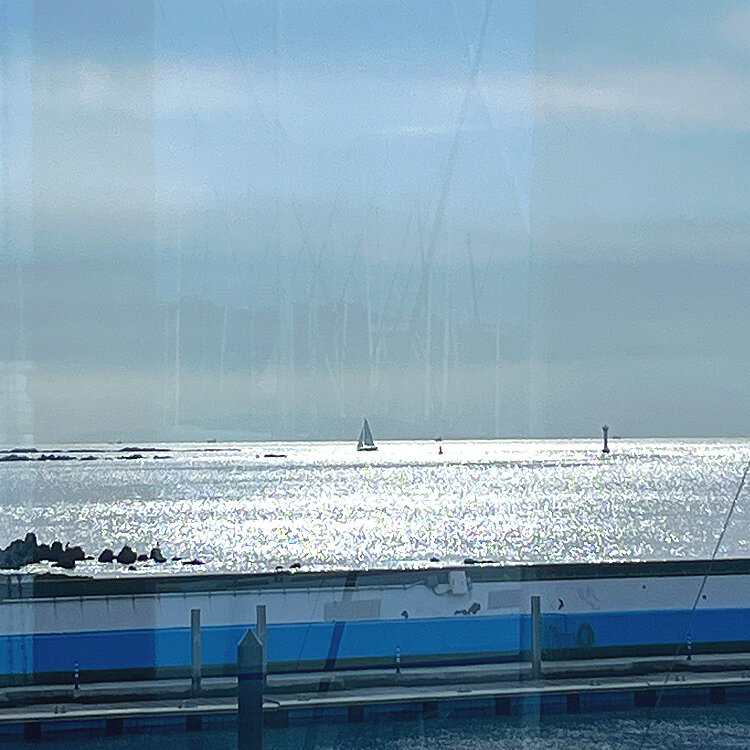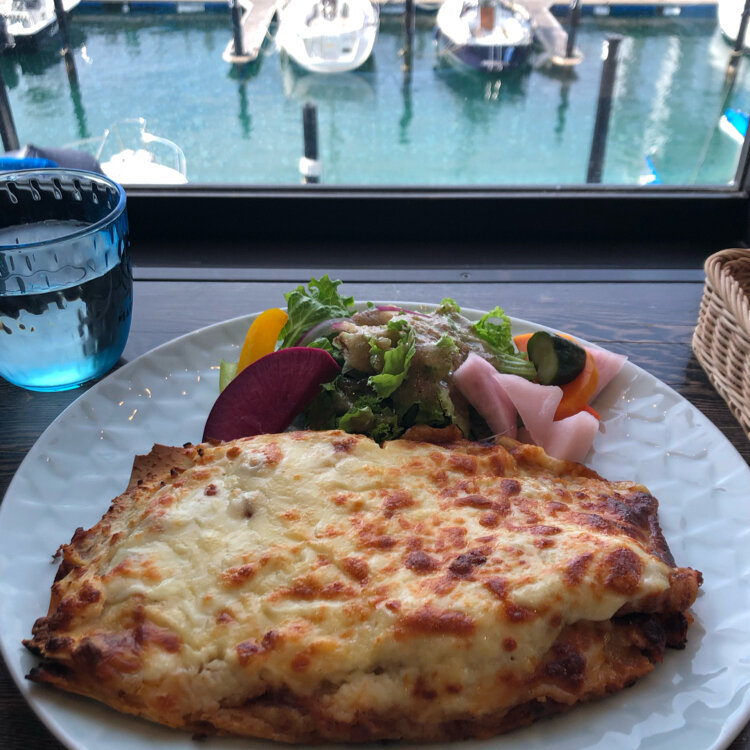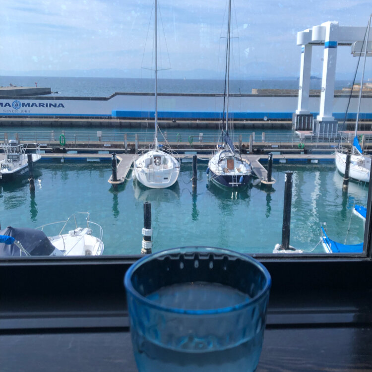 運良く、窓側の席に 座ることが出来て、停泊している 船や、穏やかな海を眺めながら、ゆったりとした 時間を 過ごしました。