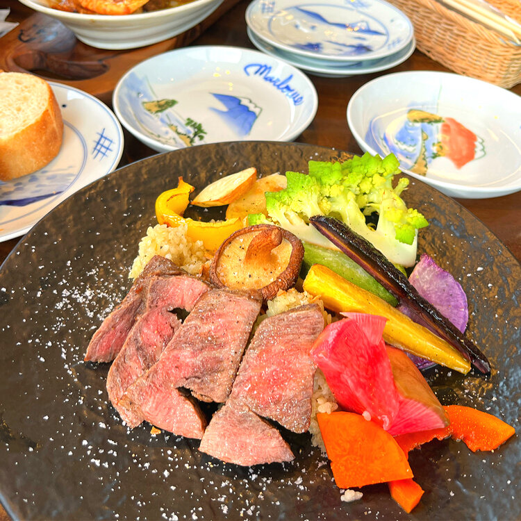 葉山牛ステーキとガーリックライス、野菜のオーブン焼きのプレートランチ。