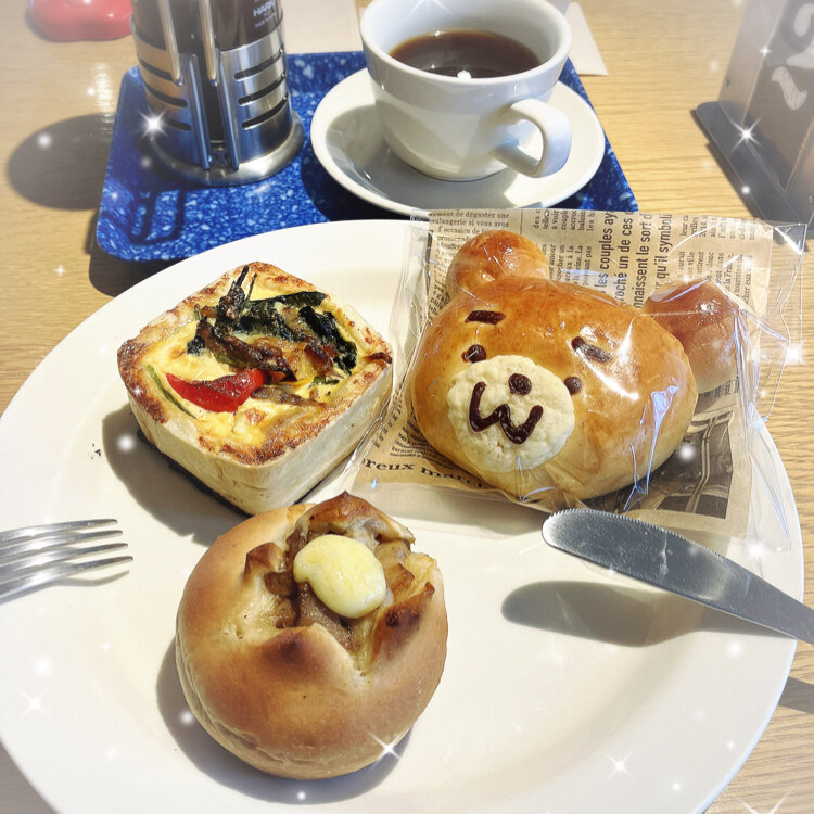 ドライブ中にふらっと立ち寄ったベーカリーでイートイン☕️プレス珈琲、キッシュ、豚角煮パン、くまちゃんの濃厚クリームパン😌