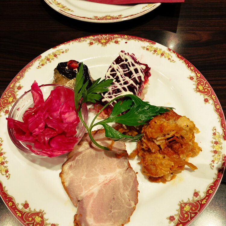カフェロシア 吉祥寺のロシアンレストランへ 本場の味のボルシチとビーフストロガノフをいただきました♪ 前菜は盛り合わせ5品。 ニシンのパイ料理が有名みたいで みなさん食べてました😋 今度他のメニューも食べてみたいです