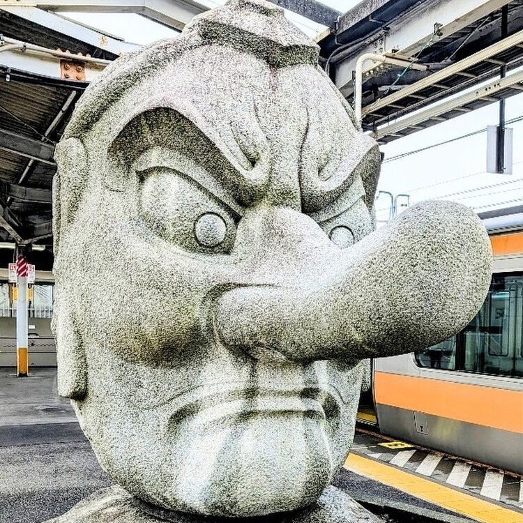 👺天狗様も花粉症で鼻水がつらそうです😂 僕も普段はマスクしてるのに雪の次の日、😷マスクしないで外出したら夜ダラダラ止まりませんでした、いつものように鼻炎カプセル💊飲んで止めました。翌日からはちゃんとマスクして外出し薬も飲まず、何とも無く過ごせてます😀。 #花粉症 #高尾駅 #jun_flat