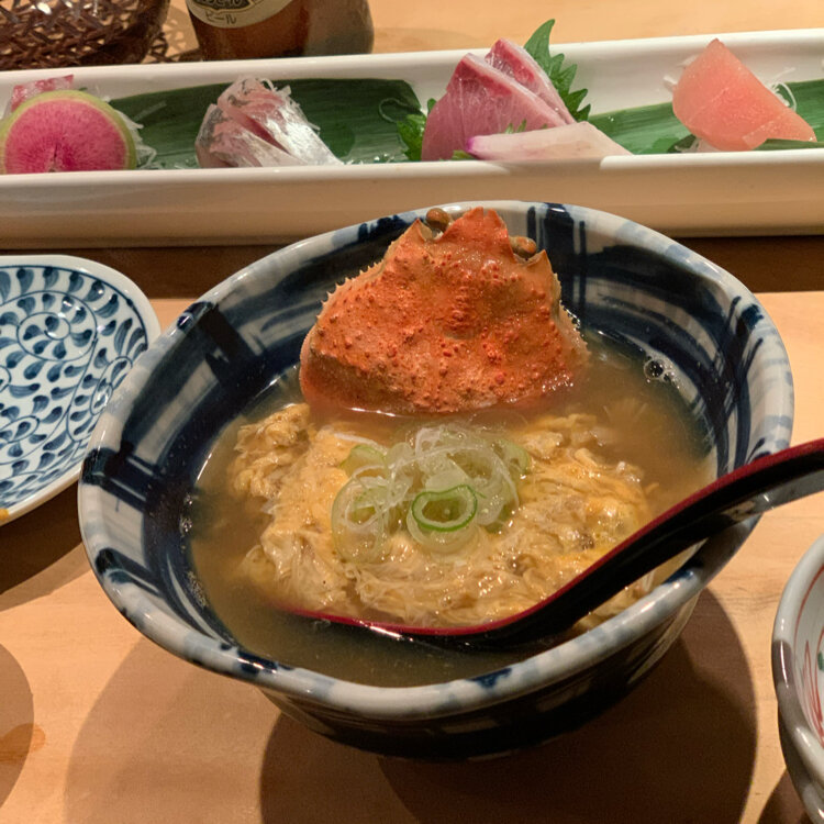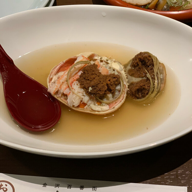 霜月の金沢のご飯。 ズワイガニの雑炊。 香箱がにのカニ面。 車麩の存在感たっぷりの金沢おでん。 豆皿茶屋の殿御膳。 そして 近江町市場の活気。