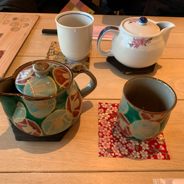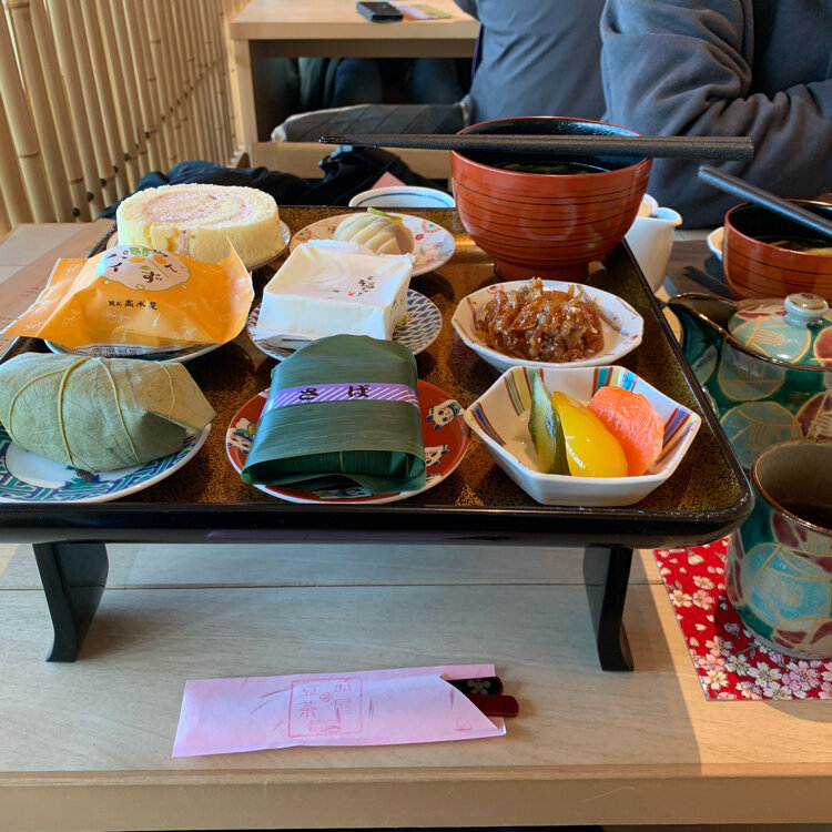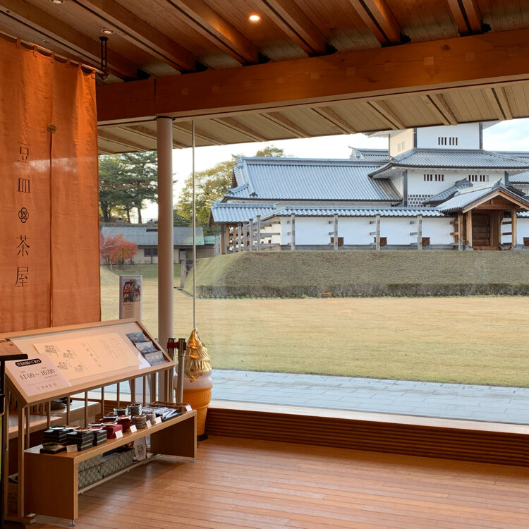 金沢城公園の中にある『豆皿茶屋』。 これは殿御膳。 九谷焼の豆皿に 名物のお菓子やお寿司が かわいく並んで出て来ました。 お茶の入った器も可愛い九谷焼。 お城と広いお庭を眺めながらいただけるのも 嬉しい御休み処です。