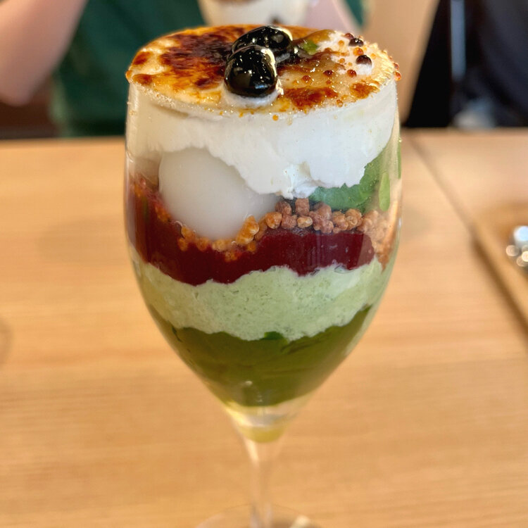そして仲良く和三盆のキャラメリゼをパリパリってして、チーズクリーム、抹茶アイス、白玉、カシスジュレ、抹茶ゼリーと次々に口の中を楽しませてくれます♡