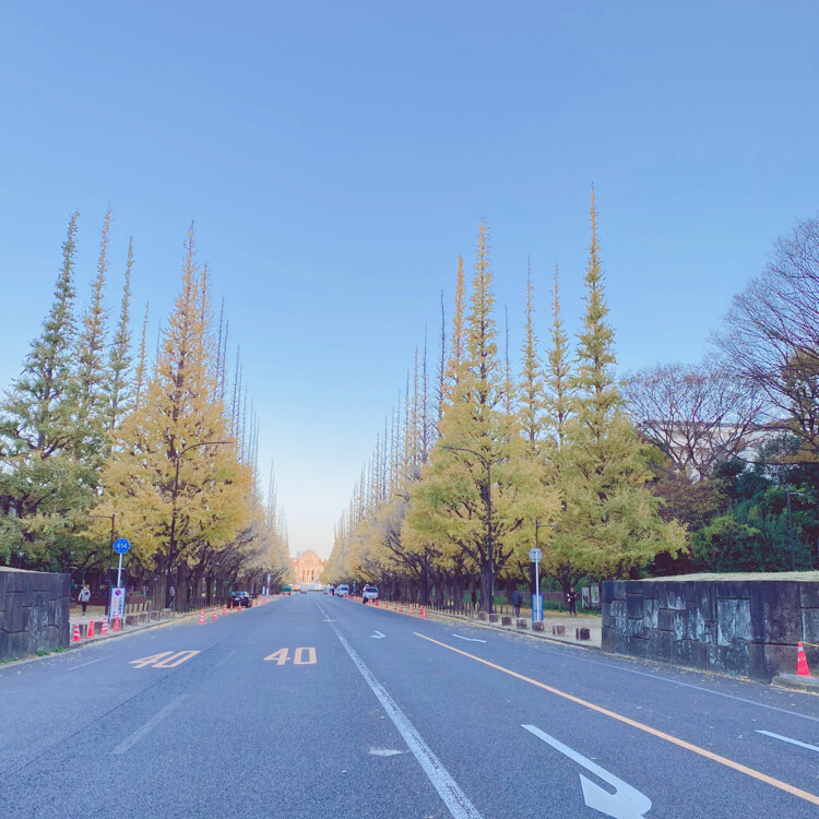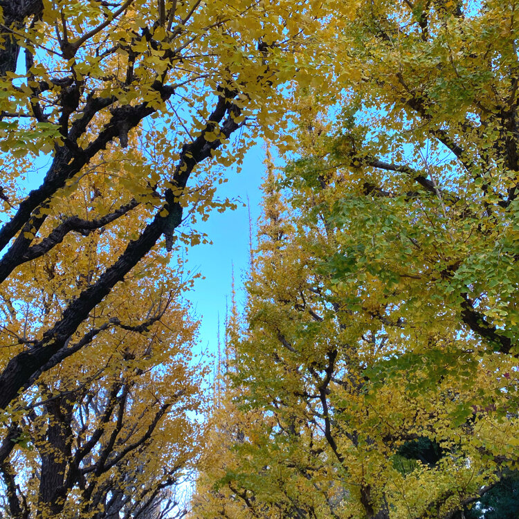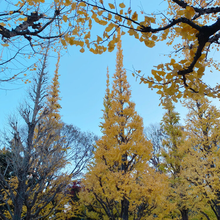 💛 神宮外苑の銀杏並木💛💛💛 早起きして7時頃に着いたので、ランニングや犬の散歩してる人がちらほらいるぐらいでした。 結構落葉していて、近くで見るとスカスカの木が多かったです😵🍂 ここの銀杏の木は上が細くなっていて、ほかの銀杏とは形が違って面白いなあと思って調べてみたら、4年に1度剪定をしているそうです💛
