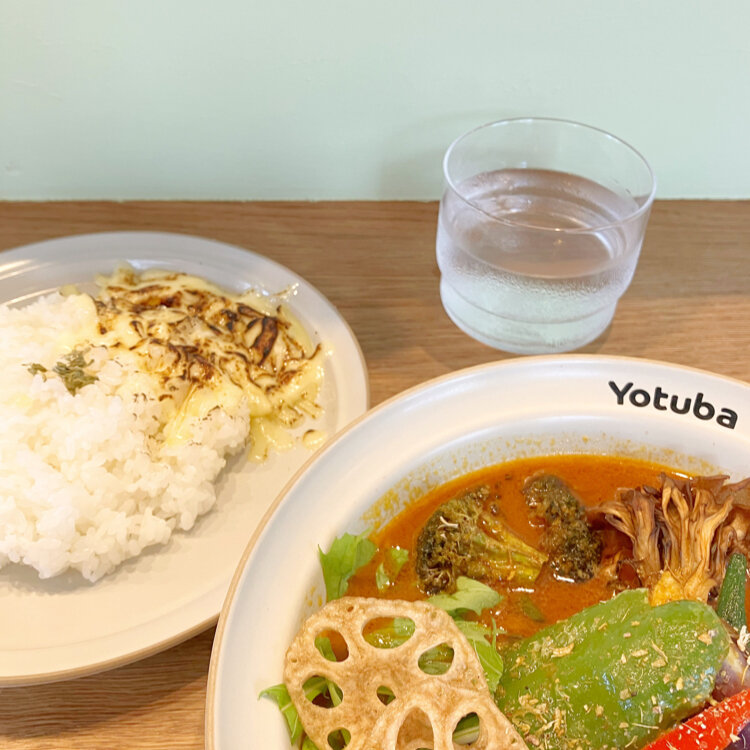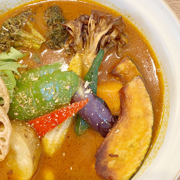 以前から気になっていたカレー屋さん、三島広小路にある「スープカレーよつば」さんでランチ🍽スープはトマトスープとえびスープから選び、具材はチキンレッグと5種類のやさい、やさしいやさい13品目の2種類、追加でトッピングもいろいろあります。今回は、えびスープでやさしいやさい13品目、炙りチーズトッピングで注文♪