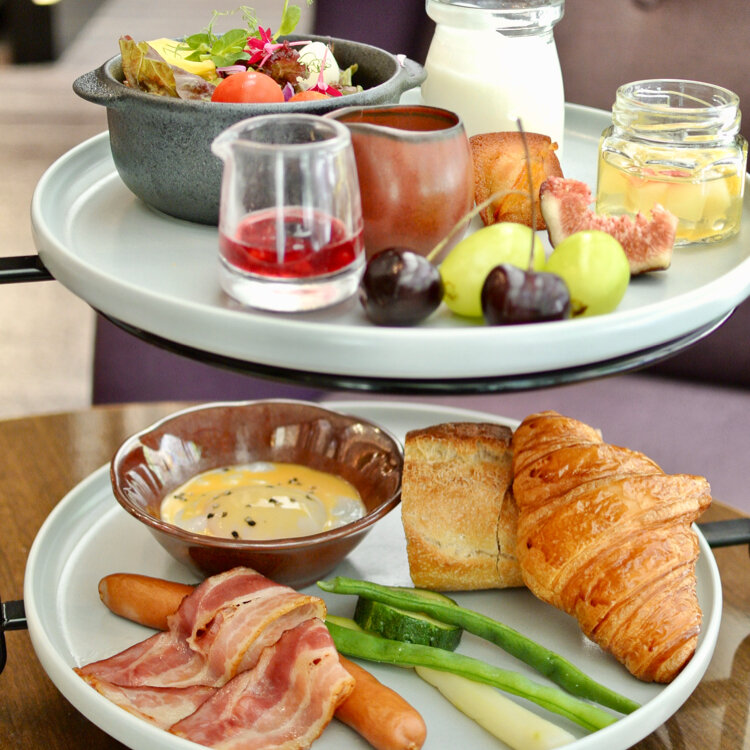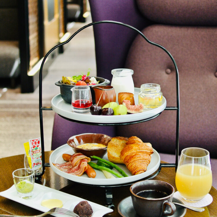 二段のティースタンドにメゾンカイザーのパンや浅草ソーセージ&ベーコンを使用したこだわりの朝食です。