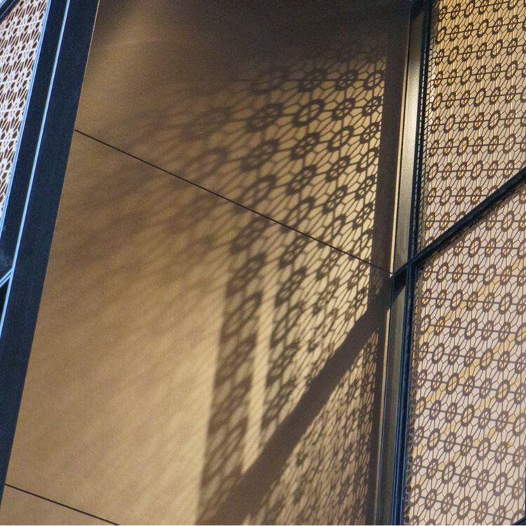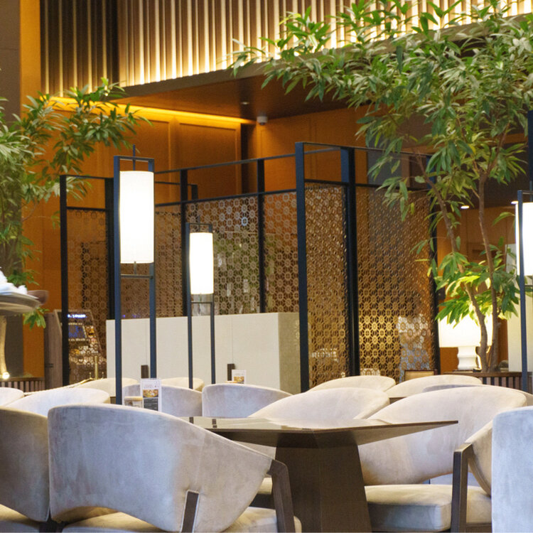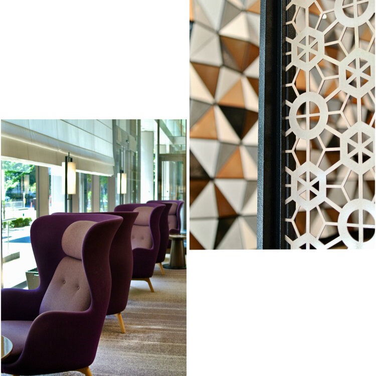 江戸小紋の桜亀甲紋と薩摩島津家の家紋【丸に十字】をあしらった間仕切りや切子細工を表現した壁面アートなど歴史ある土地の記憶を思わせる粋なインテリアが素敵です(写真3枚目)