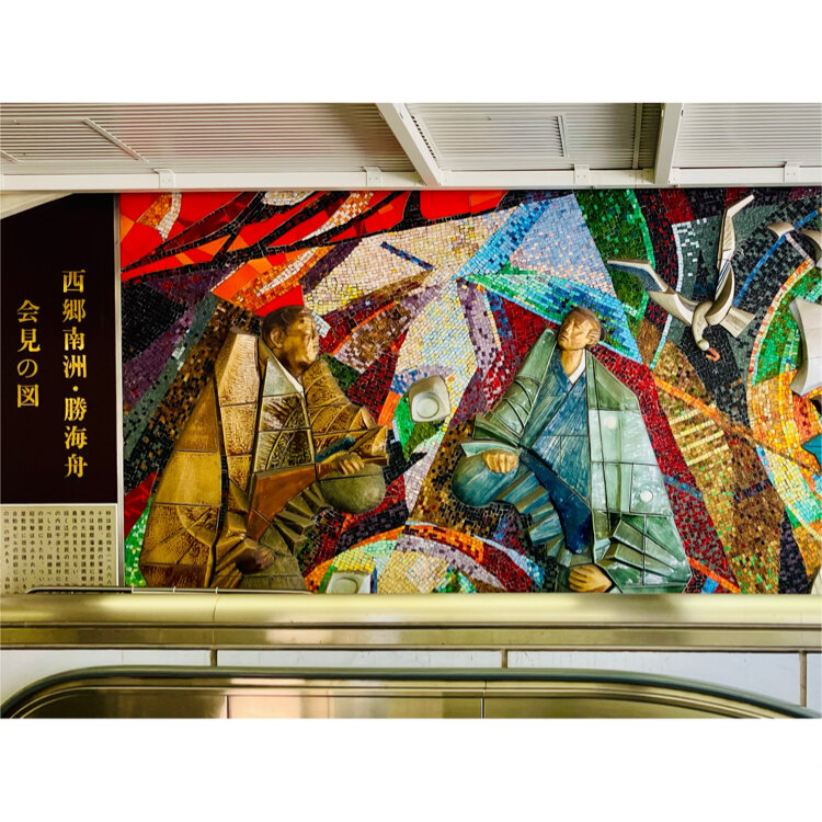 最寄りのJR田町駅には勝海舟と西郷隆盛の会見の図があります(写真4枚目)