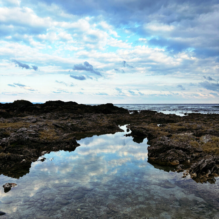 サンゴで出来た平坦な地形には、多くの潮溜まりがあり、貝や海藻、色とりどりの魚が群れ遊ぶ、海幸の宝庫です。
