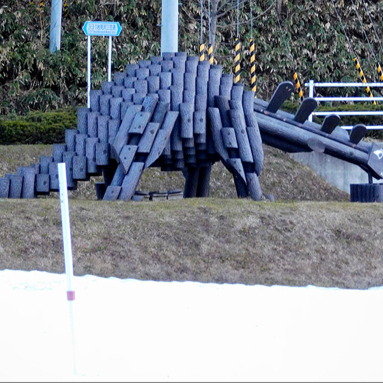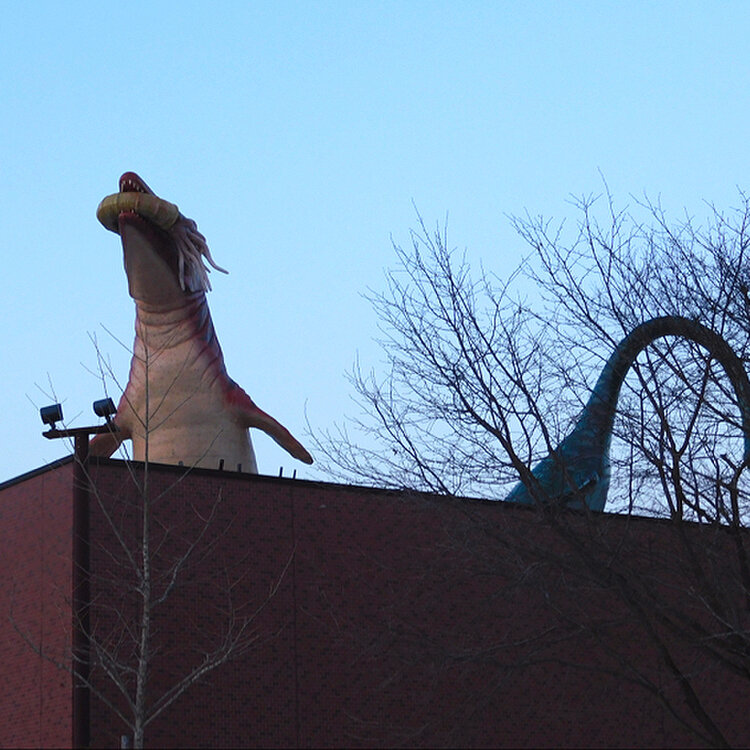 写真一枚目、外観の屋上からは海生爬虫類のオブジェがアンモナイトをくわえて
