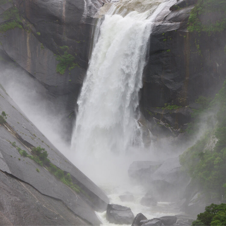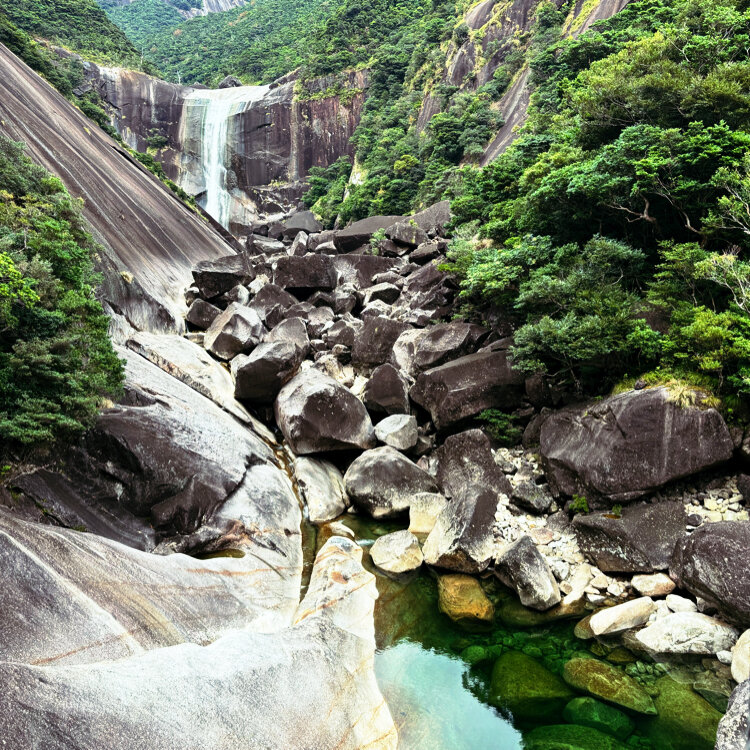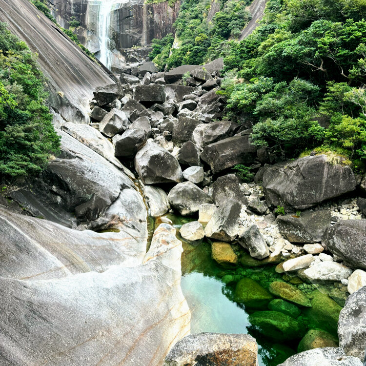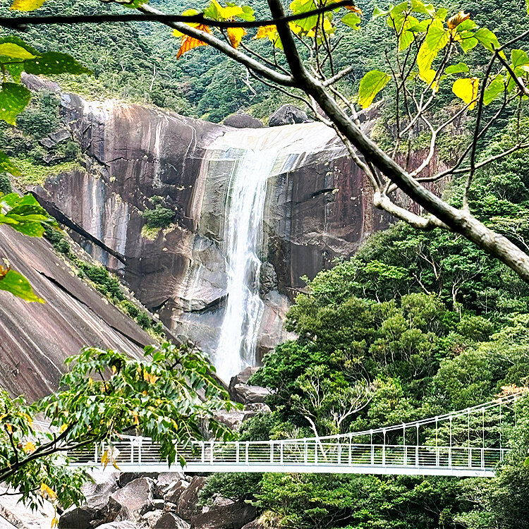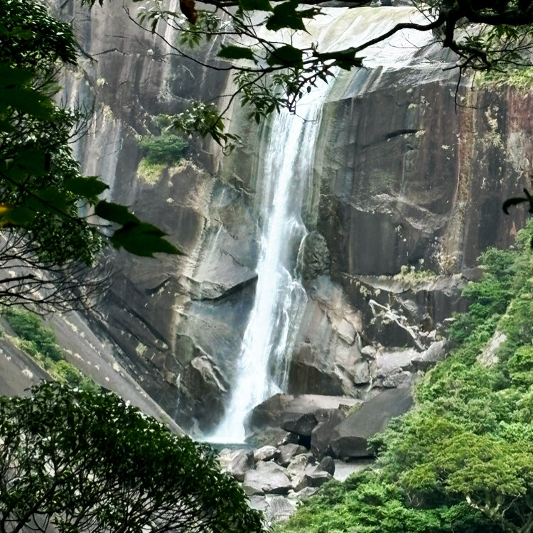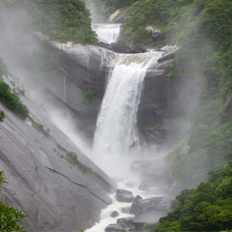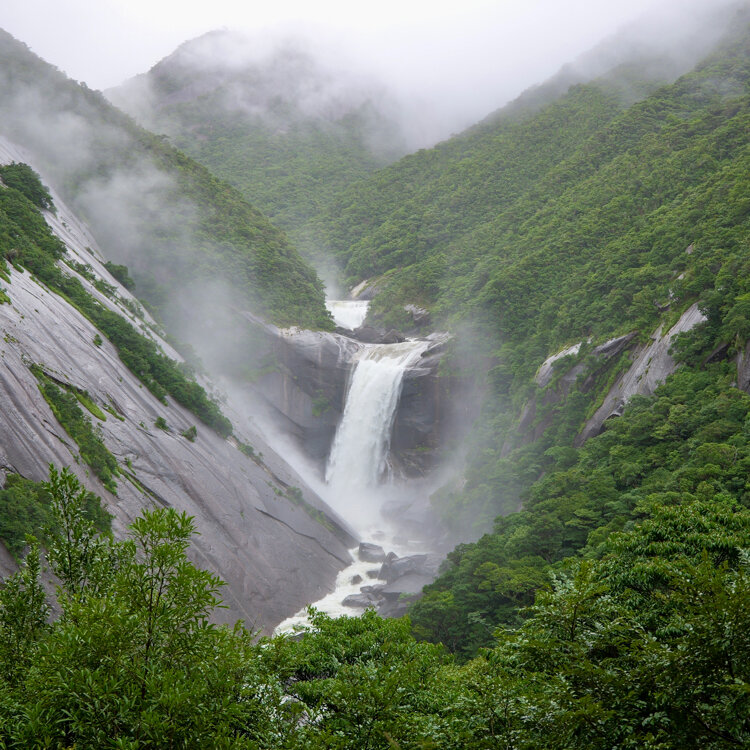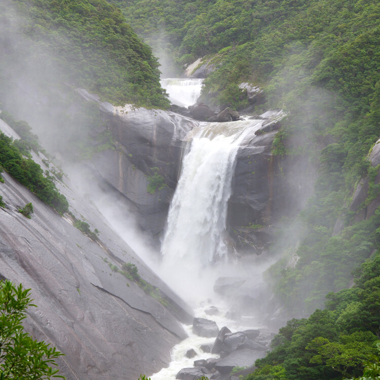年間を通して屋久島に降る多量の雨は、いく筋もの川となって岩や山を削り、海へと注ぎます。千尋滝はモッチョム岳の裾の巨大な花崗岩の岩盤を鯛之川が刻んで、壮大なV字谷の景観をつくりだしたもので、滝の落差は約60メートルです。中央から大量の水が流れ落ちる屋久島を代表する滝の一つです。