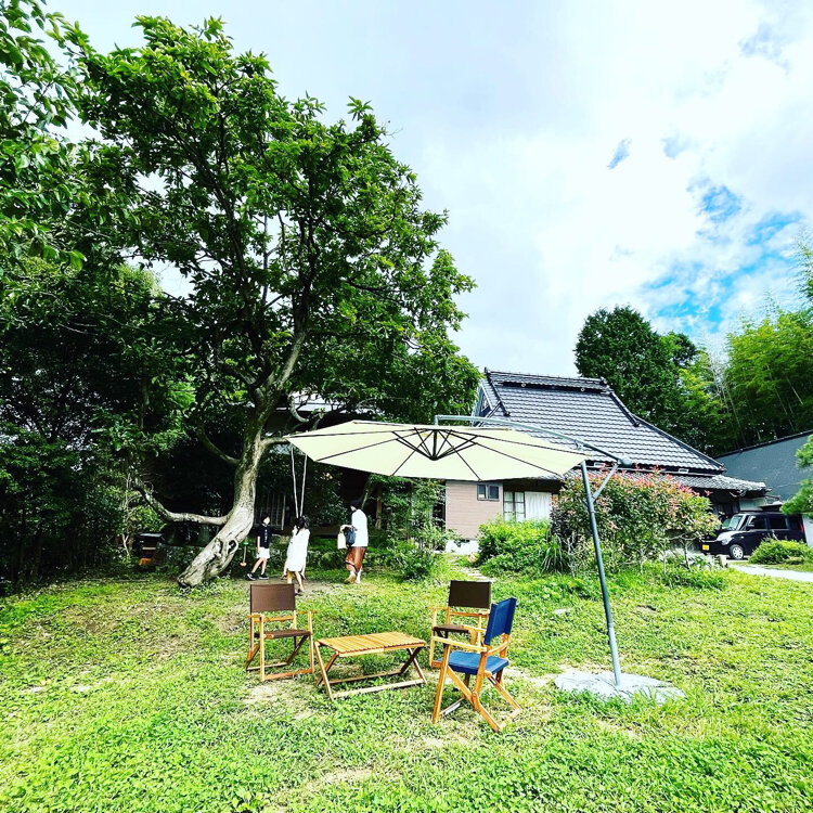 他にツリーハウス、畑を見下ろすテラス席、お庭にはパラソルとテーブルセットがあります