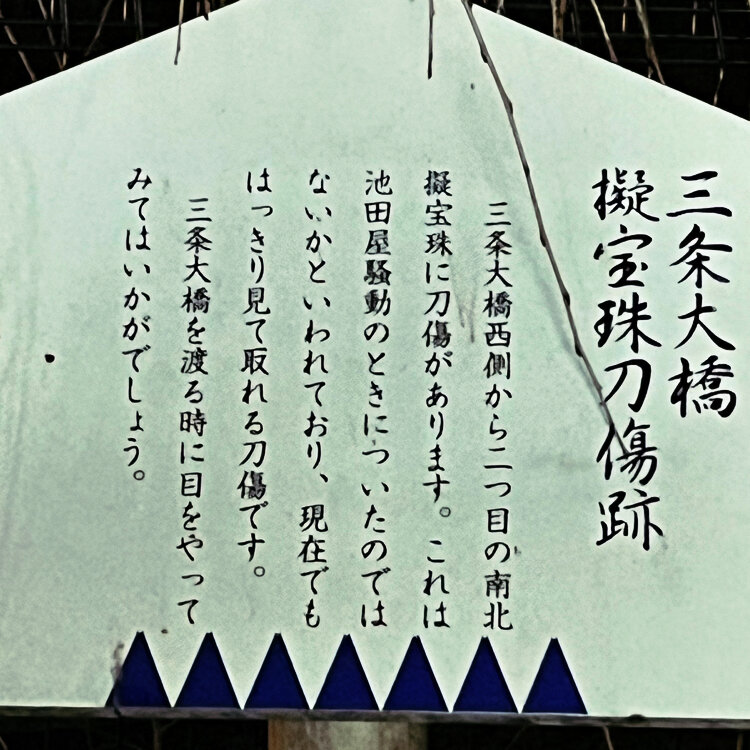 この擬宝珠の刀傷は池田屋騒動の際についたもの、と言われているようです。池田屋からここまで斬り合ってついたとか何とか。すごいですね😳