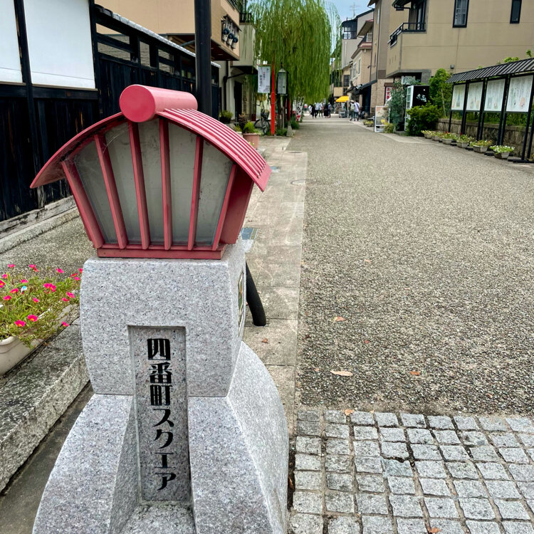 「四番町スクエア」は、「大正ロマンあふれるまち」をキャッチコピーに、モダンな外観で統ーされた建物と、広場に設置されたガス燈、ところどころに置かれたモニュメントなど、新しくてどこか懐かしい出会いのある街です。