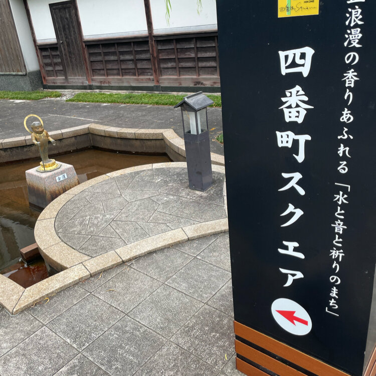 ひこにゃんには、お天気が良いと「彦根城天守前」、お天気が悪いと「玄宮楽々園御書院」で会えますが、土日祝日の11:00~11:30には、「四番町スクエア」にも登場するとの事で、「四番町スクエア」近くの駐車場に車を停めました。