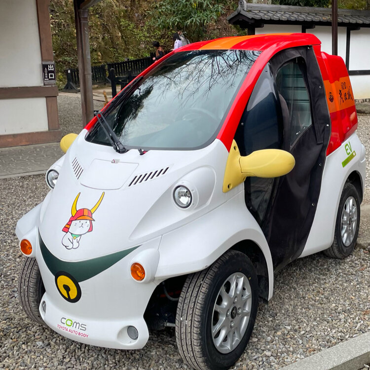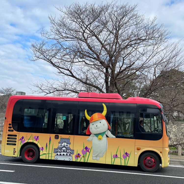 彦根市のあちらこちらにひこにゃんが溢れていて、ひこにゃんのラッピングバスや彦根城内の移動用EV車体(ひこにゃん、井伊の赤備えラッピング)を見かけました。