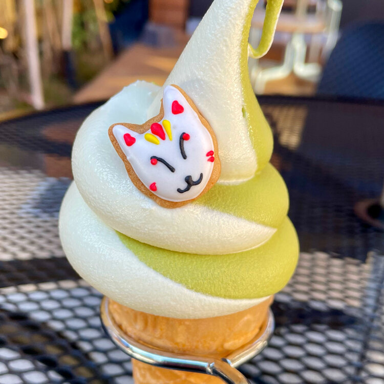 北海道ミルクや厳選抹茶を使用したソフトクリームにオリジナルで製作したアイシングクッキーをトッピング出来ます。クッキーは、(白キツネ.黒キツネ.鳥居.伏見稲荷)の4種類の中から選べます。