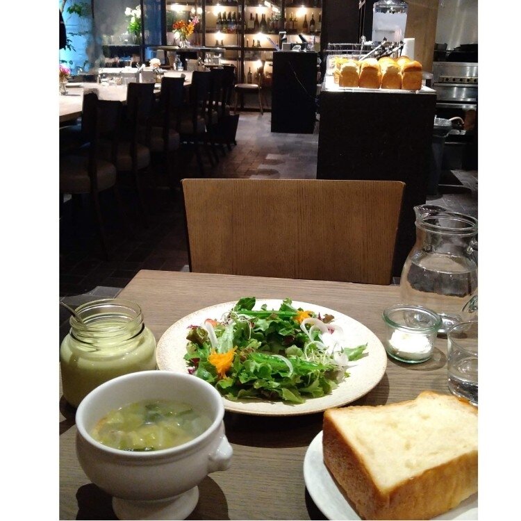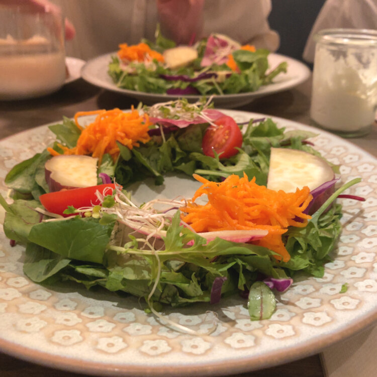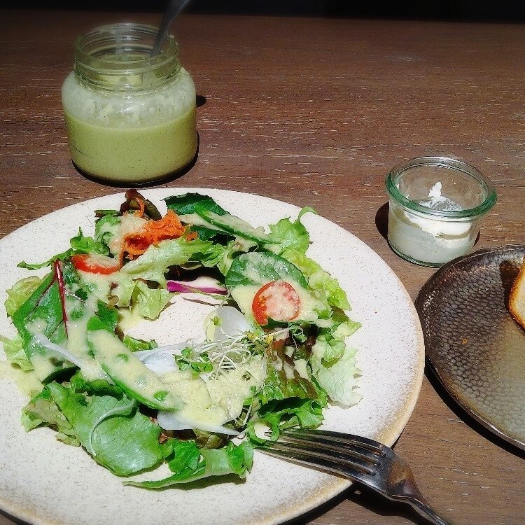 店内で焼かれるパンと有機野菜のリースサラダに掛けるオリジナルドレッシング、そしてホイップバターの美味しさに驚きました💚