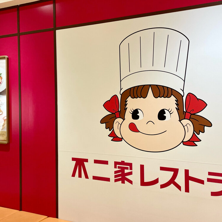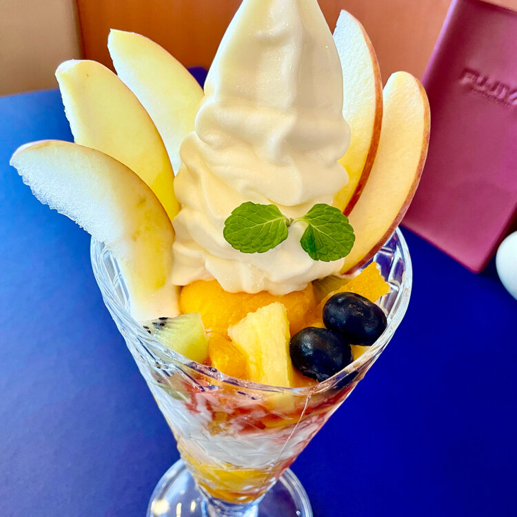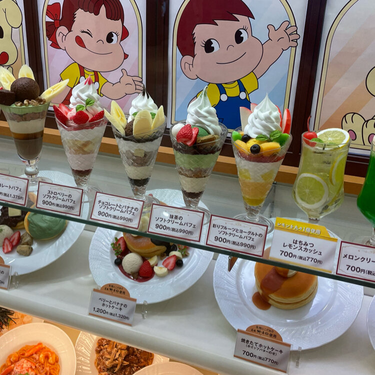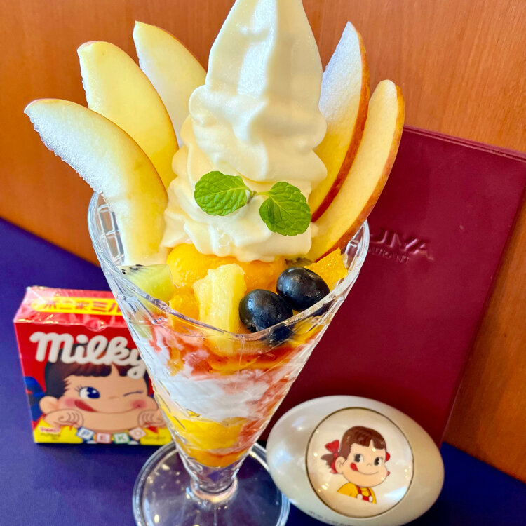 #不二家レストラン#フルーツパフェ#ペコちゃん可愛い#果物たくさんヨーグルト#ミルキー味のソフトクリーム#朝パフェ