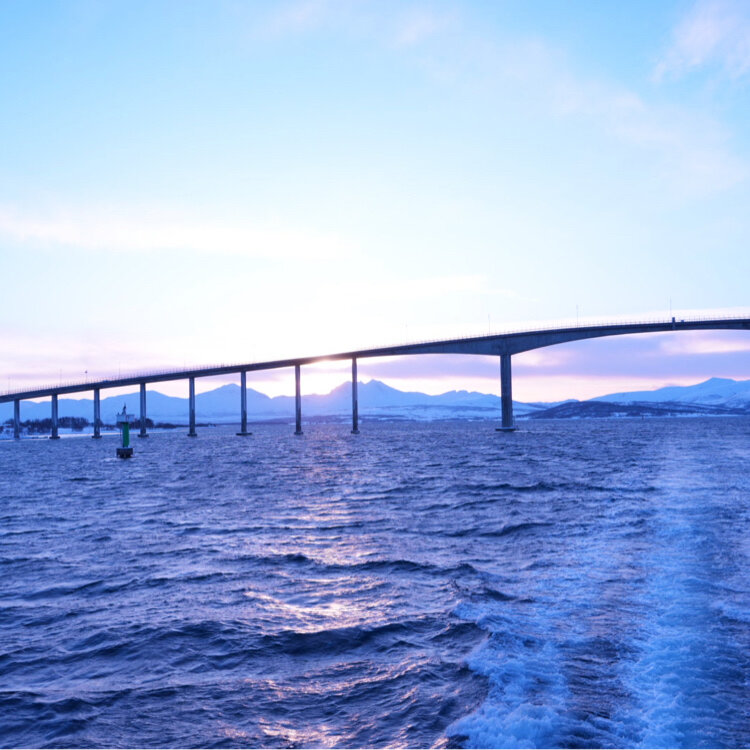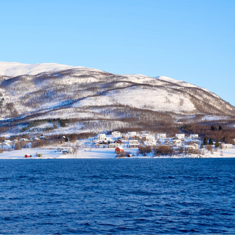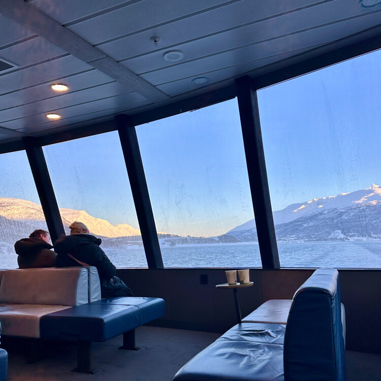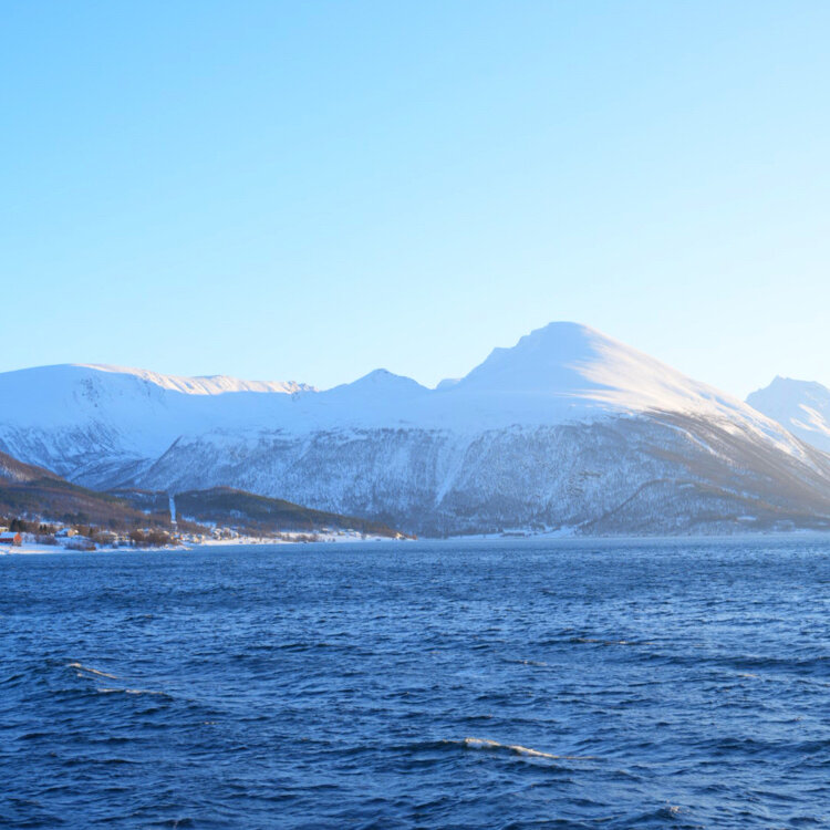 羽田から飛行機を2回乗り継いで、まずはノルウェー北部、世界最北の大学もあるトロムソ(Tromsø)に滞在しました。予想に反してお天気がよかったので、トロムソ周辺のフィヨルドをまわる3時間半ほどのクルーズを当日に予約して海からの景色も楽しむことに。