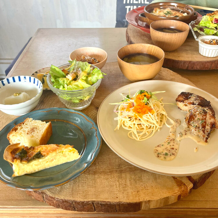 メインはチキンソテーのハニーマスタードソース。付け合わせのサラダスパゲティにトッピングのプチプチとびこもおいしい!おかずにはカレーサラダ、豆のトマト煮、ふろふき大根、フォカッチャ、キッシュ、サラダ、野菜スープ。