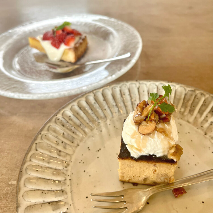 食後のデザートにはいちごのレアチーズケーキ。お友達はメインはグラタンでデザートはナッツ入りキャラメルチーズケーキっぽいのでした。