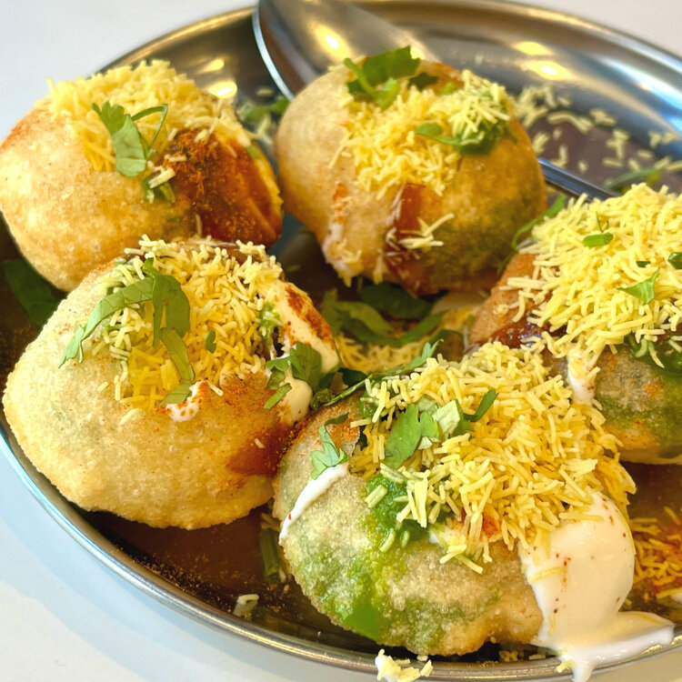 ウラド豆の粉から作ったスパイス入り揚げ団子にヨーグルトソースをかけたインドのおつまみ。