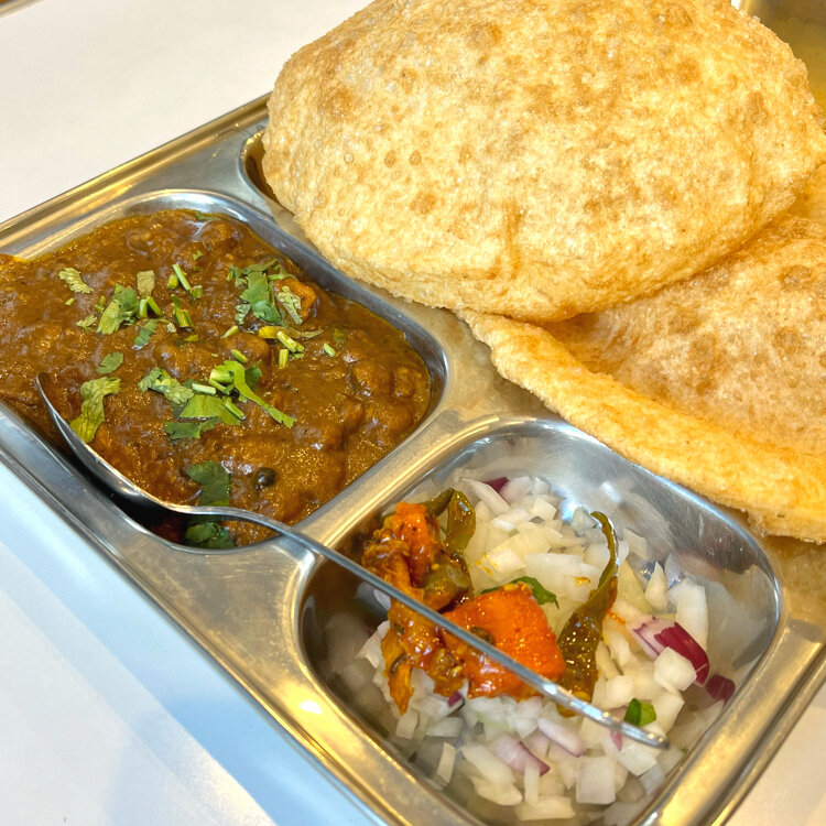 ひよこ豆のカレーを「バトゥーレー」というインドの大きな揚げパンでいただきます